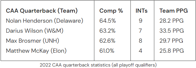 Here’s a list of the other CAA playoff teams (& QBs) from 2022 and where their season totals ended up in these two areas.