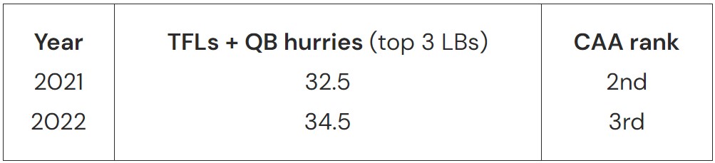 Huesman had a few interviews back in 2018/2019 discussing how he wanted to get back to keeping offenses “off-schedule,” as the Spiders weren’t creating enough negative plays to continually keep offenses behind the chains. 2021 and 2022 have both seen great disruption caused by our top-3 linebackers, and although this is directly correlated to D-line play it does show how this group is improving in both the run & pass game. Nearly 24 TFLs and 11 QB hurries from our top-3 backers last season displays the improvement in our blitz packages and run fits, and outside of the W&M game very few offenses looked comfortable for four quarters. Hard to really set a target, especially if we don’t play the base 4-3 as much this season, but I’d like to imagine our top LBs can keep these two statistical categories near the top of the CAA once again.