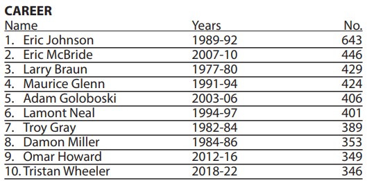 As you can see from the UR career tackling numbers (above), Wheeler will almost certainly claim the #2 spot but has literally not shot at #1. Passing All-American, National Champion, and local legend Eric McBride (LC Bird high school) will be an incredible feat for Wheeler and ultimately speaks to his toughness. There’s no easy games playing inside linebacker, but if you think our star LB is too good for special teams you’re thinking of the wrong guy. You’ll see Wheeler out there on the KOC unit once again in 2023, proving that his heart and toughness is the embodiment of what it means to be a Richmond Spider.