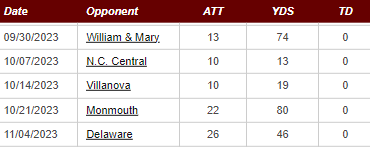 Coleman not being 100% factors in, as we’ll see 8+ carries from Wickersham if he starts. Elon also allows the 2nd lowest completion percentage and the T-2 lowest YPA, while giving up the 2nd highest YPC rushing. Coming off the bye week the well-rested Spiders should be more than happy to push Elon around, especially after their tough battle against the Blue Hens last weekend. Richmond currently has run for 100 yards in three straight games (after only hitting that mark twice in the first six) and I’m expecting us to make it four in a row.