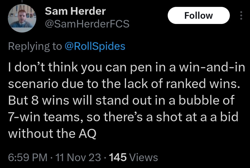 Walking out of Robins Stadium I was 99% sure a win @ W&M meant the Spiders were in – now I’m about 80% sure. I messaged with Sam Herder on a few things and here was his response to UR being a guaranteed at-large with a win at W&M.