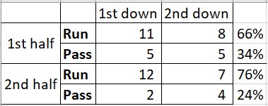 2nd half – My only negative from Elon was our passiveness to start the 2nd half, and it felt like a lot of the same in this one. We controlled the line of scrimmage the 1st half, which led to more running, yet the 1st & 2nd down run/pass ratio was even more skewed the final 30 minutes.