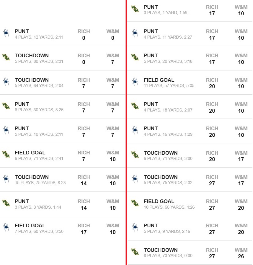 A quick opening TD for the Tribe was a shock, but this defense settled in well afterwards. The 4th quarter was a different story, surrendering three scoring drives that almost saw this entire season slip away. W&M had a similar game plan to last season and burned us in a lot of those same areas. A tremendous effort on the final play to ensure a UR victory but definitely some things to clean up before Central comes to town.