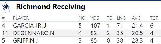 I was most impressed with Griffin as he had two very critical catches for the Spiders. The 4th down reception late in the 1st half was a great catch in traffic, and the jump ball late in the game setup another Richmond TD that put the game away. We need to keep getting DeGennaro the ball as much as we can, but if teams start to take him away it’s great knowing Griffin and Garcia Jr. can do just as much damage.