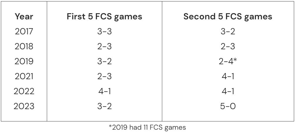 Five out the past six seasons we’ve picked up multiple FCS losses in our first five FCS games. It’s valid to say this might not happen if Mancuso doesn’t go down in 2021, however there’s a clear pattern. This season wasn’t supposed to feature a quick start, with a new QB and new play callers, but I think everyone was caught off guard by Morgan State and Hampton.