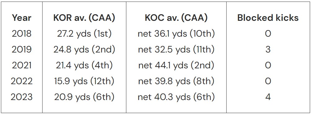 Both kickoff units got back into the top half of the CAA, we blocked more kicks, and this doesn’t even factor in Aaron Trusler’s superb 1st team All-CAA season. Plenty of reasons to be excited about this phase for the Spiders moving forward.