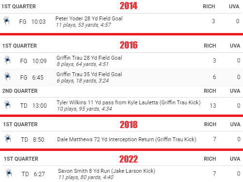 Fast start – Richmond has not been a fast-starting team in recent years, however we’ve had some quick starts against Virginia. In the last four matchups UR has scored FIRST in each game, in a variety of ways.