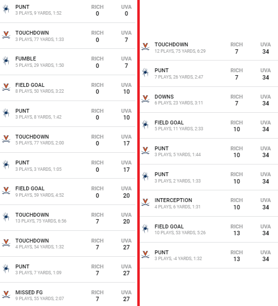 Richmond got blitzed with a quick 17-0 hole in the 1st quarter that we couldn’t climb out of. Would I have liked to see more out of the Spiders? Of course, but at the end of the day I’m never putting too much weight into these FBS matchups. UVA was better than most thought, and although some outstanding questions remain unanswered there are positives to be found.