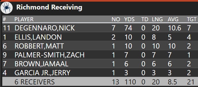 Targets will never follow the “perfect pattern” every single week, but there are some big holes in week 1. I’ll never argue about DeGennaro getting the bulk, but Griffin/Garcia Jr./Robbert combining for four targets and two receptions can’t happen when you’re struggling to move the ball. Few teams will have as strong of a #1 receiver in DeGennaro along with such talented depth behind him, and any game we don’t take full advantage of that is to our detriment. If the Spiders do get the chance to open things up in the passing game, expect those three to play a much bigger role.