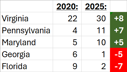A couple states make up the majority of this shift. Pennsylvania and Maryland have the biggest increases from states north of Virginia, while Georgia and Florida have big drop-offs in the southeast.