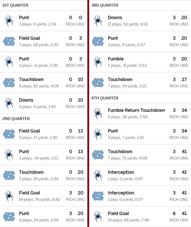 Field position – The defense got the brunt of our poor offensive display. Four of nine UNC drives started inside the Richmond 40-yard line. That helped open up their playbook and it led to 17 of the 34 points our defense allowed. There are always difficult circumstances to overcome but it painted a poor picture of how the defense did.