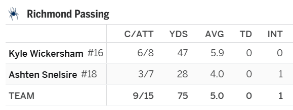 The rushing wasn’t exclusive to 1st down. Of our 64 plays, 18 were called passes. Due to three sacks we only got 15 pass attempts off all game. Even after we started rotating Wickersham & Snelsire there wasn’t much urgency to throw the ball. Again, the Spiders were never making a comeback in that game but to have our QB box score finish the way it did was depressing.