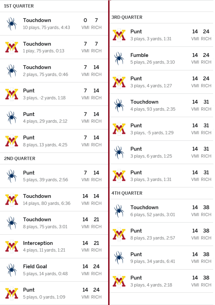 2nd half – The UR offense was able to put the game on ice by running the football because the Keydets had nothing going the final 30 minutes. VMI’s 2nd half offense was as boring as the lightning delay, with the Spiders suffocating them each drive.