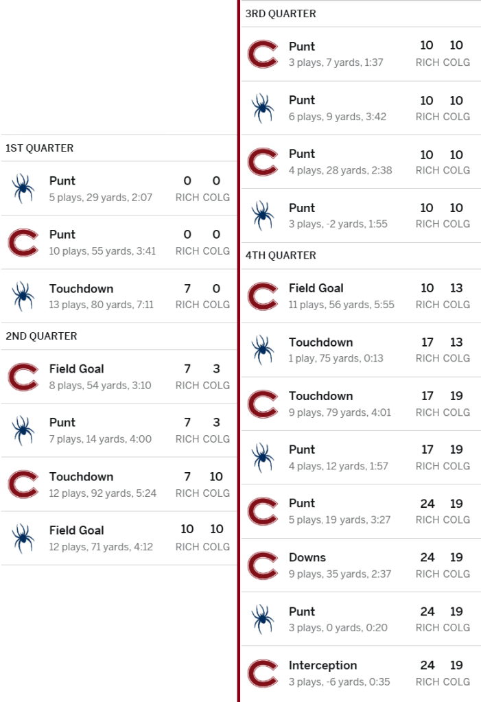 A lot of yards but not a lot of points. We gave up over 400 yards but got key stops when we needed them, especially in the 4th quarter. Coach Wood wasn’t happy with untimely penalties and a couple of the longer drives allowed but the defense put us in position to win. Colgate had four redzone trips but only managed two TDs, as the Spider D holding them to field goals twice ended up being the difference.