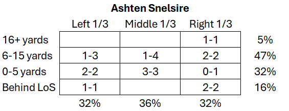 Downfield passing – The additional running led to us not getting many downfield shots in. The huge completion to Andreas Hill was our only target in the 16+ bucket as we didn’t take/couldn’t find open receivers downfield.