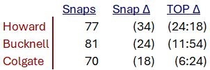 Time of possession – I talked about this in the Colgate recap and wanted to expand on it here. Our defense has been out on the field plenty the last three weeks, playing WAY more snaps than the offense (Snap Δ) and causing a huge discrepancy in time of possession (TOP Δ).