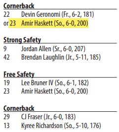 Interesting to note, Amir Haskett is now listed at safety AND corner on the two-deep. He’s been at safety the entire season but injuries (Stocker) and redshirt limits (Bullock & Washington) have depleted our corner depth.