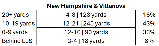 60% of UNH/Villanova passes were thrown 10+ yards downfield against the Tribe defense, leading to over 350 yards. A strong majority of their passing production relied on attacking W&M deep, the perfect compliment to a good run game. This feels like a great time for Foster-Powell to shine but we have to keep the trio of Griffin/Dawson/Hill involved. Thanks to our 4th quarter surge against Lafayette, UR finished with three 50+ yard receivers for the third time this season. Using all three wideouts to stretch the field would be a promising sign after some strides made last weekend.