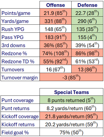 Numbers in green are top 1/3 in the FCS, numbers in red are bottom 1/3