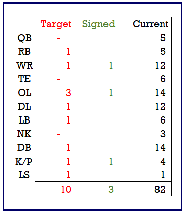 Quarterback, Tight End, and Nickel I think we’re fine at. I’ll start listing nickel separately since it’s worth breaking out from LBs/DBs.