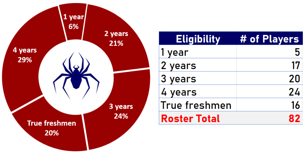 If the Spiders can get one more grad transfer to return, we only need five more guys to get into the high 80s. That’s a fine spot for us to sit but the pie chart does point out something glaring. Our total numbers will end up fine but our experience continues to decline. Right now we have just five players on the 2026 roster that are on their final year of eligibility. That’s great we’re playing young guys but our balance of youth/experience is leaning too heavy towards the youth. That’s why retaining older players is super important, even if they aren’t starters. With the Patriot League graduate transfer rule still in effect, “older player” retention becomes extra important. Guys like Cam Byrd and Carter Glassmyer coming back are huge not only for their on field performance but also for the experience and leadership they bring to a young locker room.